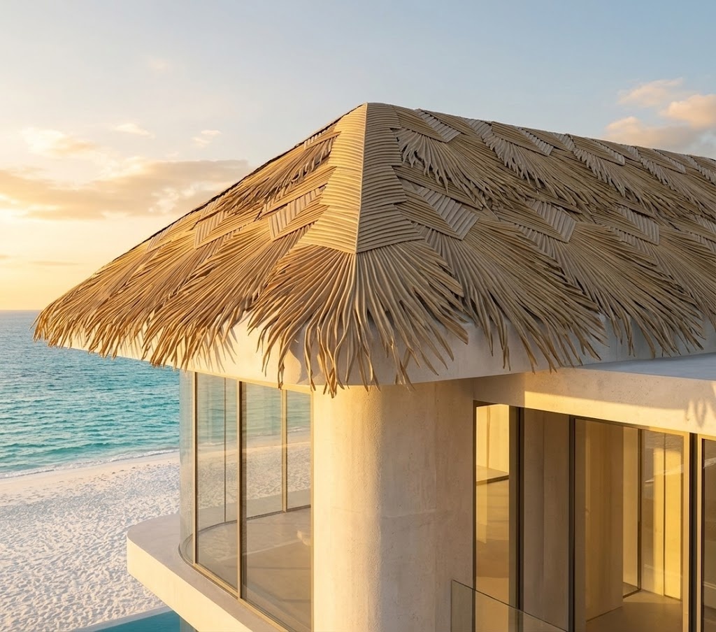 We produce this piece from Modified HDPE, so you can plan for long-term outdoor use. Furthermore, Multi-color Customizable options let you match light, medium, or dark palm tones and blend the hip detail into the field panels. For water management, you should build the roof with correct layers; therefore, when you combine proper underlayment, flashing, overlaps, and fastening methods, you can support a waterproof thatch system approach (installation dependent). For safety-driven projects, you can also align the roof assembly with fireproof thatch goals by selecting compliant rated materials and following local codes (specification dependent).