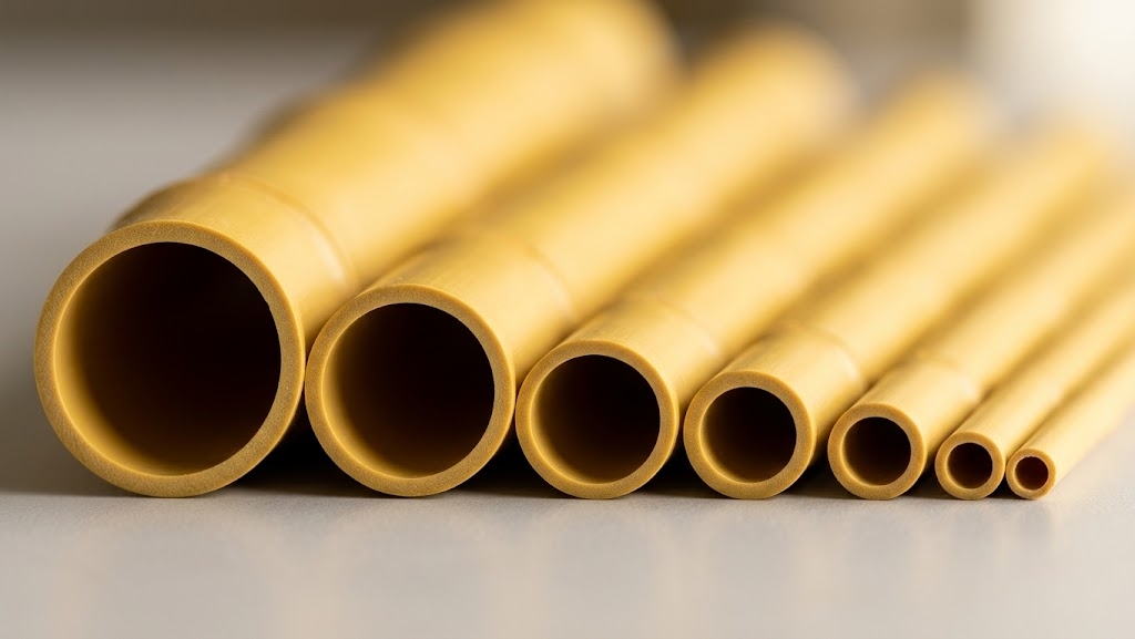 Composite long bamboo pole for bamboo fence projectsMacro photo looking down the tubular end openings of three different diameter Synthetic Long Bamboo Poles, highlighting the precise, clean cuts and consistent wall thickness of the durable material.