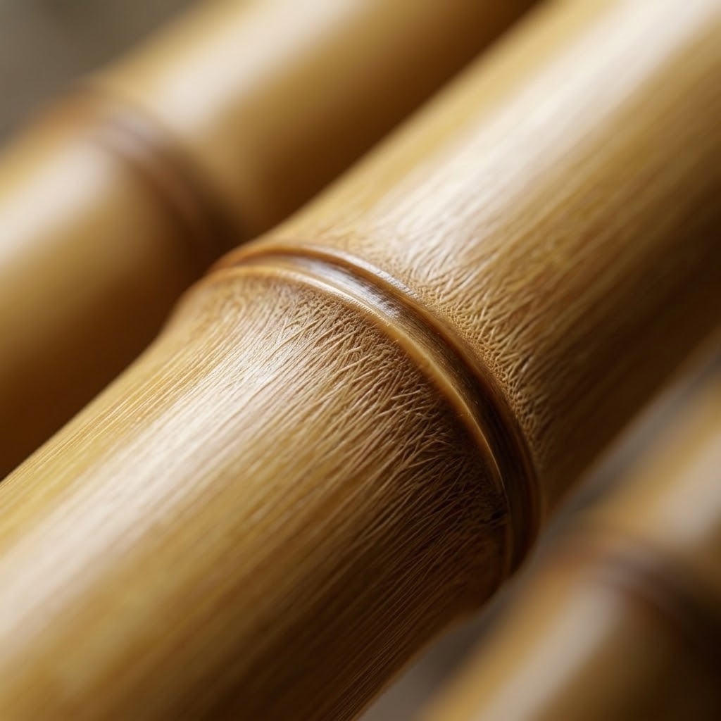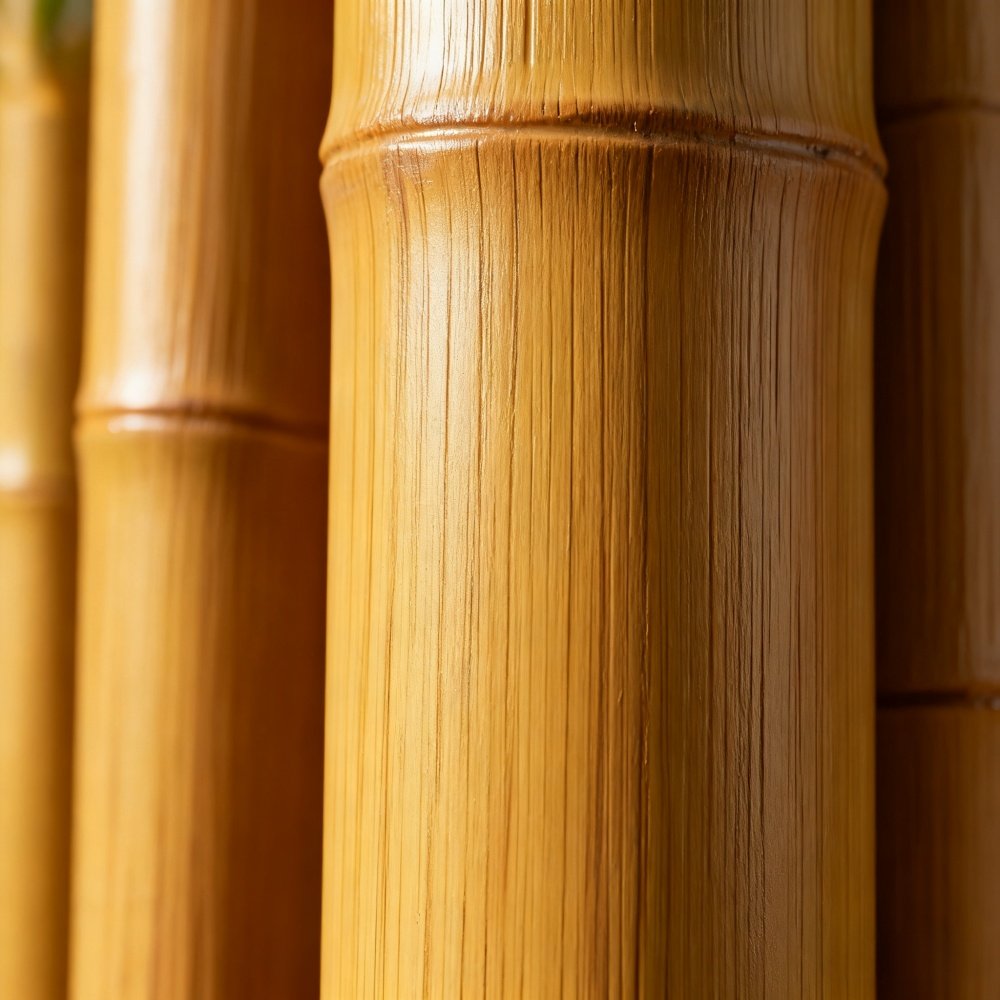 Materials, color, and sizeClose-up view of the realistic fiber texture on a synthetic bamboo pole made from modified HDPE, highlighting its detailed fibre imitation and weather-resistant coating.
