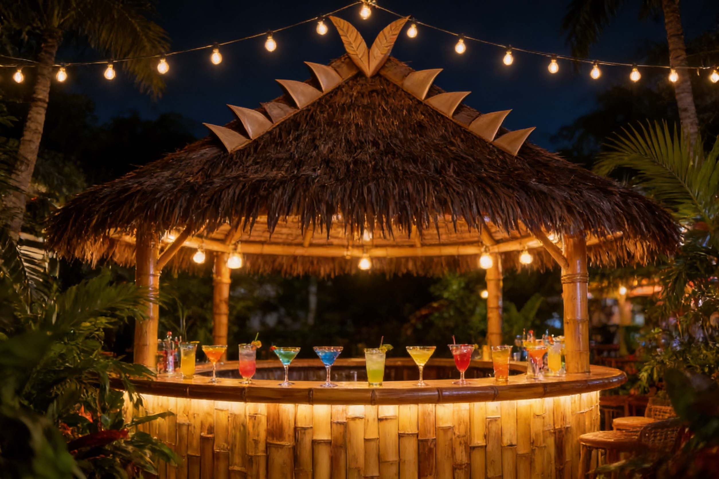 • Tropical rainforest climates: ridge closure that performs better under long-term moisture exposure in thatching projects.Dark brown V-shaped synthetic thatch ridge cap installed on tiki bar roof at night, warm string lights, bamboo bar with cocktails, tropical atmosphere, straight edges with pointed leaf tips.