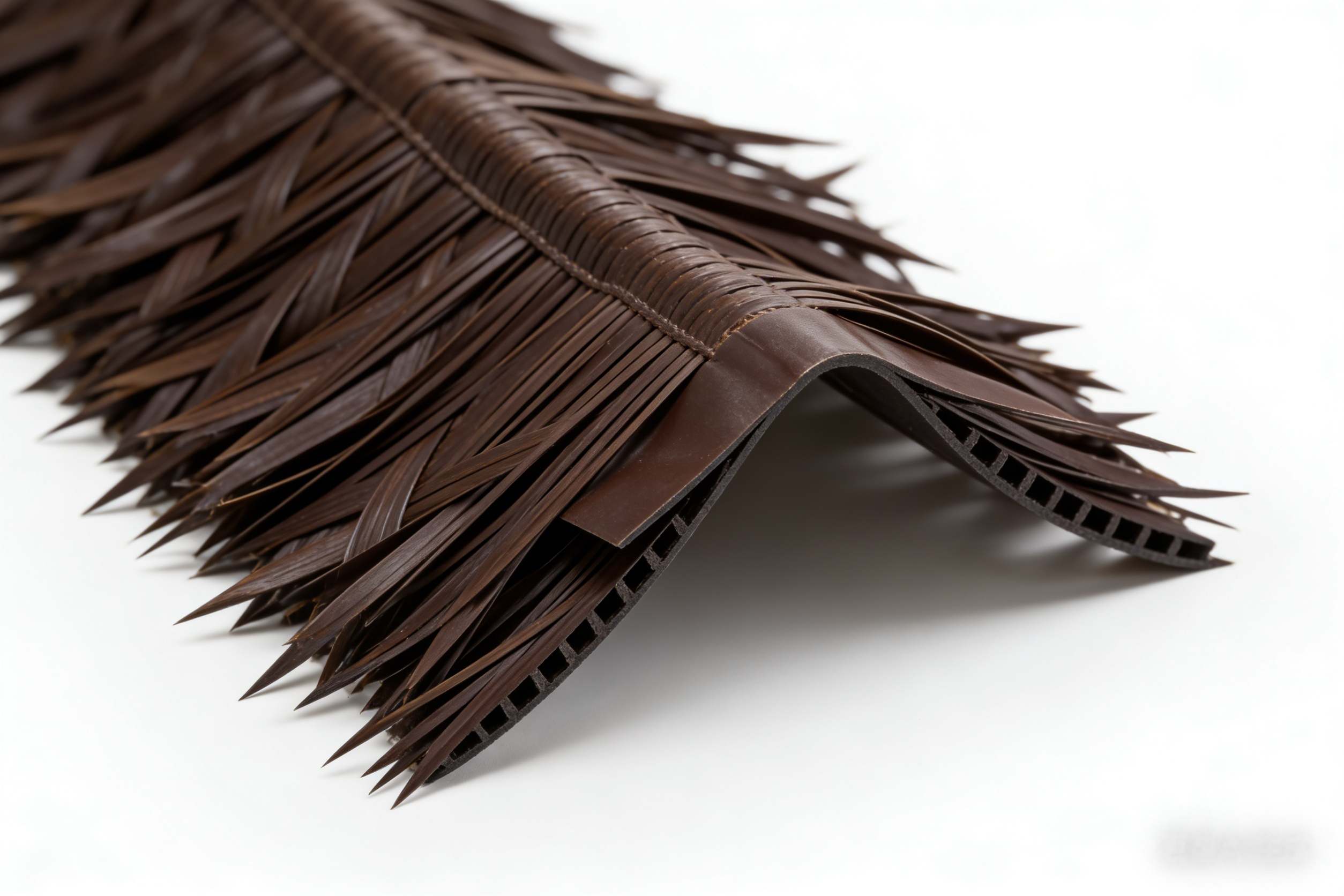 Customization optionsMacro close-up of dark brown V-shaped synthetic thatch ridge cap showing pointed leaf tips and straight edges, detailed HDPE woven texture, slight lengthwise curve visible.